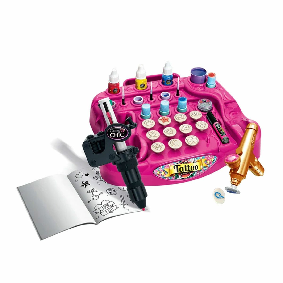 Favori dövmeni yapman için içinde çizimler, ipuçları ve beyaz sayfalar bulunan dövme kitabı, yarattığın dövmeleri boyayabilmen için vücut boyaları ve süngerler, aplikatörler ve stensiller içerir.