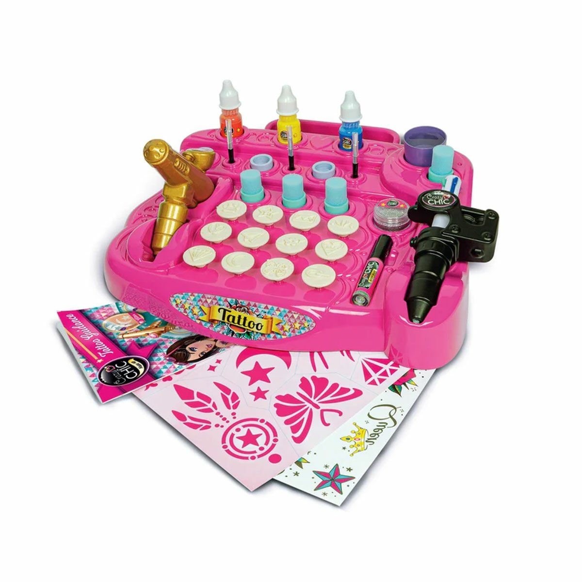 Kızlar, değiştirilebilir renkli başlıklara sahip özel vücut kalemini kullanarak kendi kişisel dövmelerini tasarlayarak ve elleriyle veya stensiller yardımıyla bunları çizerek eğlenebilirler.