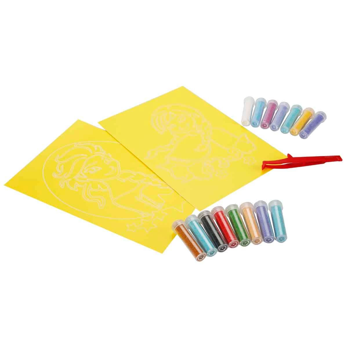 Kutu içerisinden çıkan renksiz kağıtların yapışkanlarını sökerek eğlenceye başla. Koyu renklerden başlayarak dilediğin renkteki kumu, favori karakterinin resminin üzerine doğru dök. Yapışkan sayesinde kum, kağıtta sabit kalacak ve Frozen karakterlerinden Elsa ve Anna renklenmeye başlayacaktır. Tüm resmi renklendirdikten sonra kağıt üzerinde kalan fazla kumu silkeleyerek çalışmanın son haline gururla bakabilirsin.