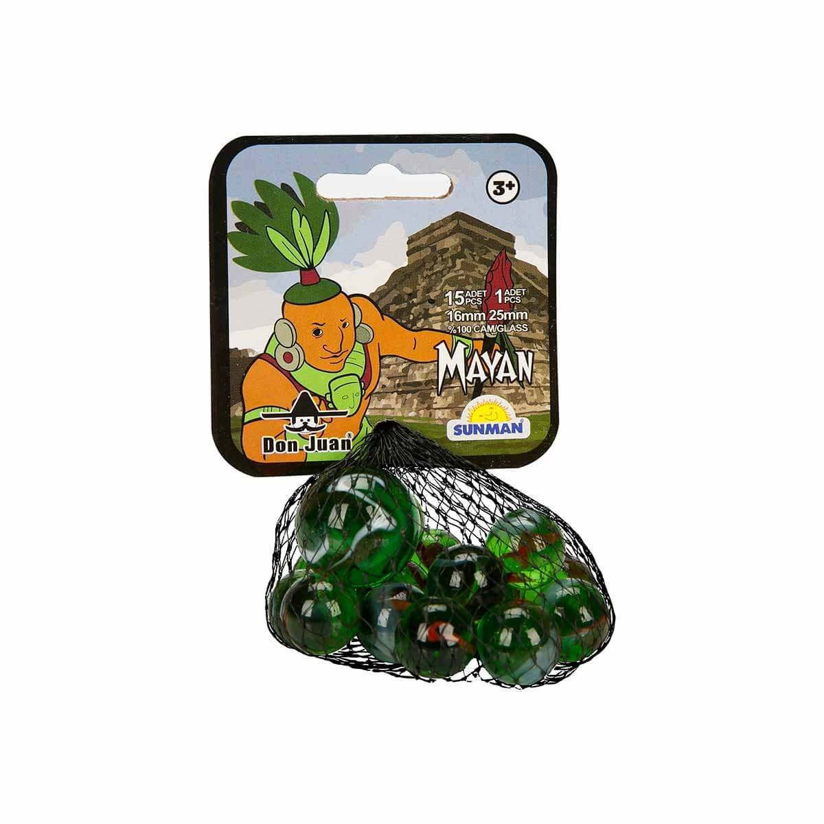 File içerisinde; 15 adet normal boy ve 1 adet büyük boy olmak üzere toplam 16 adet cam misket yer almaktadır.