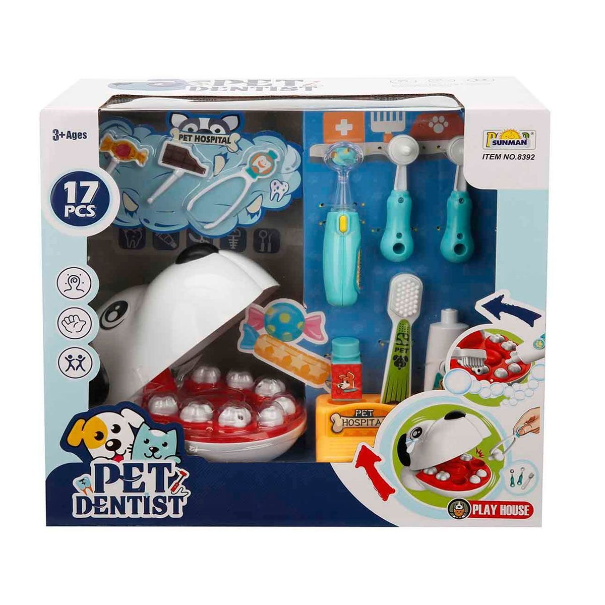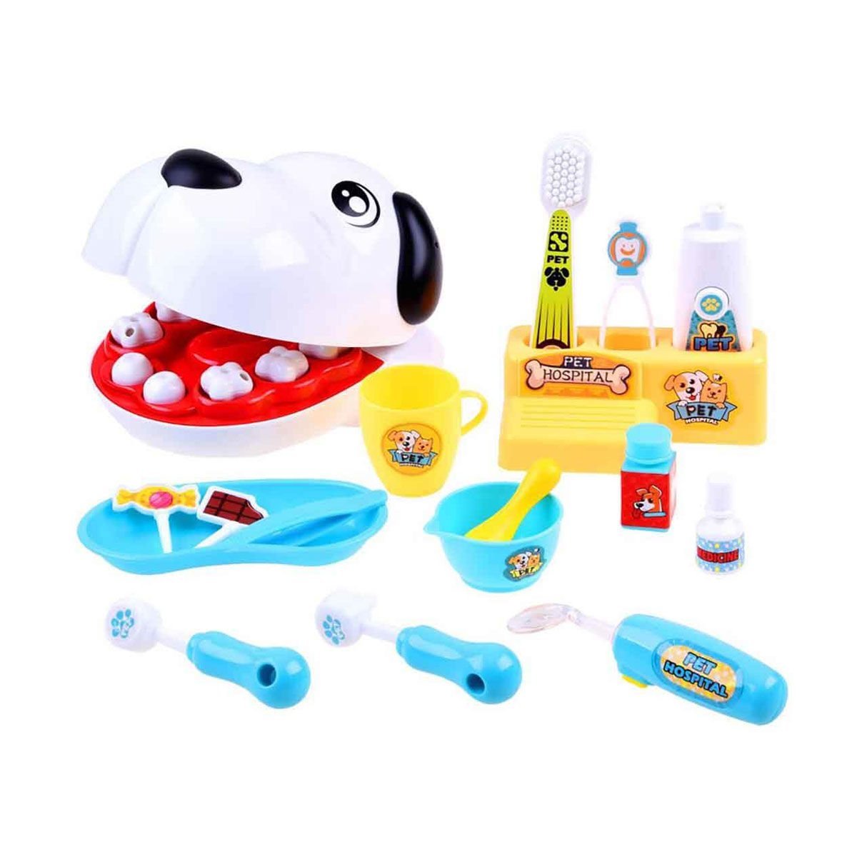 Set içerisinde; 1 bardak, 1 ayna, 2 dolgu yapma aleti, 1 cımbız, 1 diş macunu, 1 fırça, 2 ilaç kutusu, 1 mama kabı, 1 mama kaşığı, 2 parça şeker, 1 diş çekme aleti, 1 alet koyma tepsisi, 1 fırçalık, 1 çıkarılabilir dişlere sahip büst olmak üzere toplam 17 parça yer almaktadır.