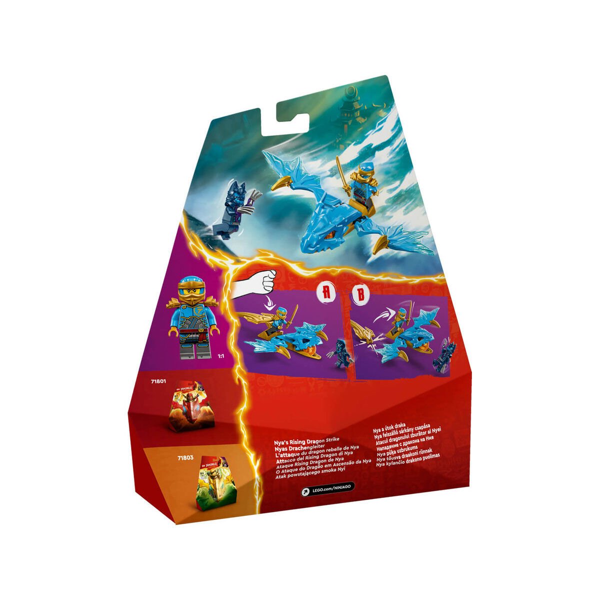 Bu yapım seti, 2 minifigürle birlikte gelir: Katana aksesuarı olan ve ejderha modeline binebilen Yükselen Ejderha Nya ve pençeli Kurt Maskeli Pençe Savaşçısı. Çocuklar, mavi ejderhanın hareketli ağzının içinden turuncu ejderha gücü parçasını kazanmak için ninja figürleri arasında efsanevi savaşlar gerçekleştirebilir.
