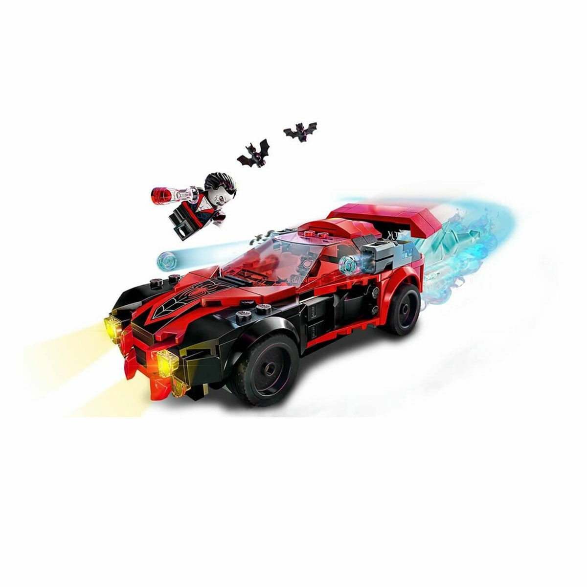 - Gerçekçi aksiyon – 2 simgeleşmiş minifigür, Miles Morales ve Morbius ile 2 mermi atıcı ve arka kısımda turbo ile güçlendirilmiş otomobil