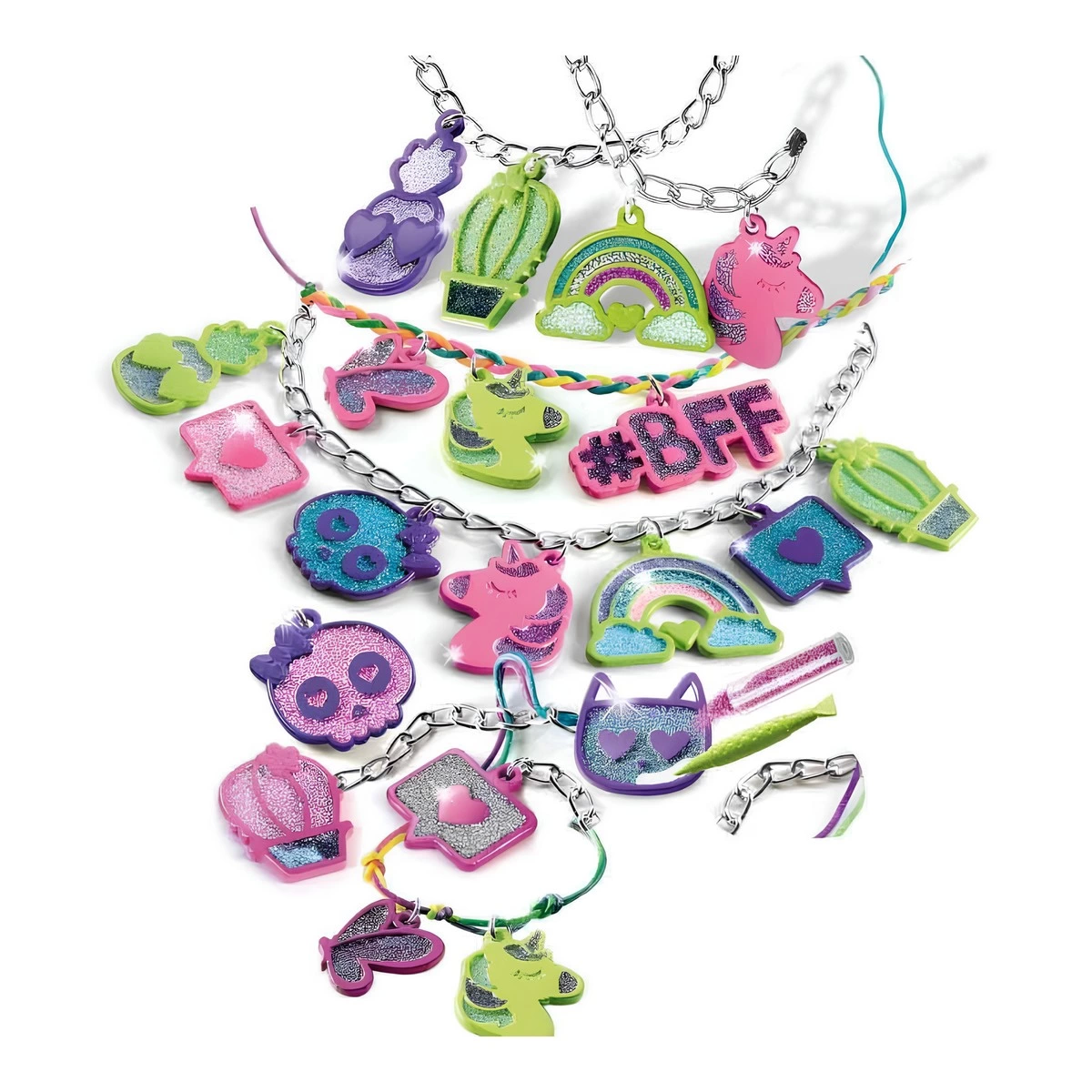 İçinde birbirinden havalı ve tarz kolyeler oluşturman için gereken her şey mevcut. Unicornlu, gökkuşaklı, kedili plastik süslerini