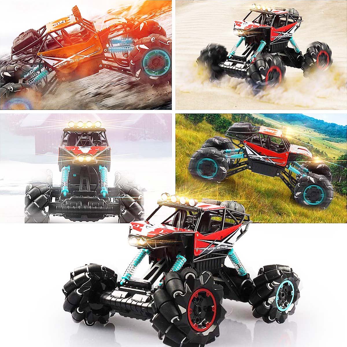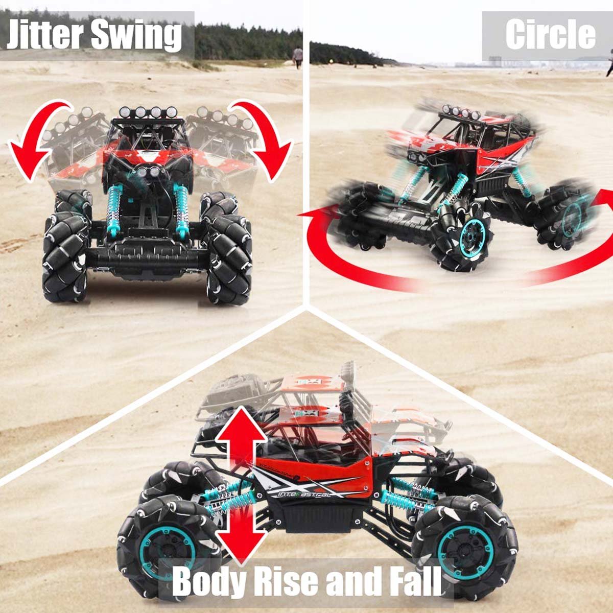 Bu RC kamyonları yön kontrolleriyle çalıştırın veya yanal kaymalar, rotasyonel dönüşler ve değişik sürüş yapmak için gelişmiş dublör araba düğmelerini kullanın.