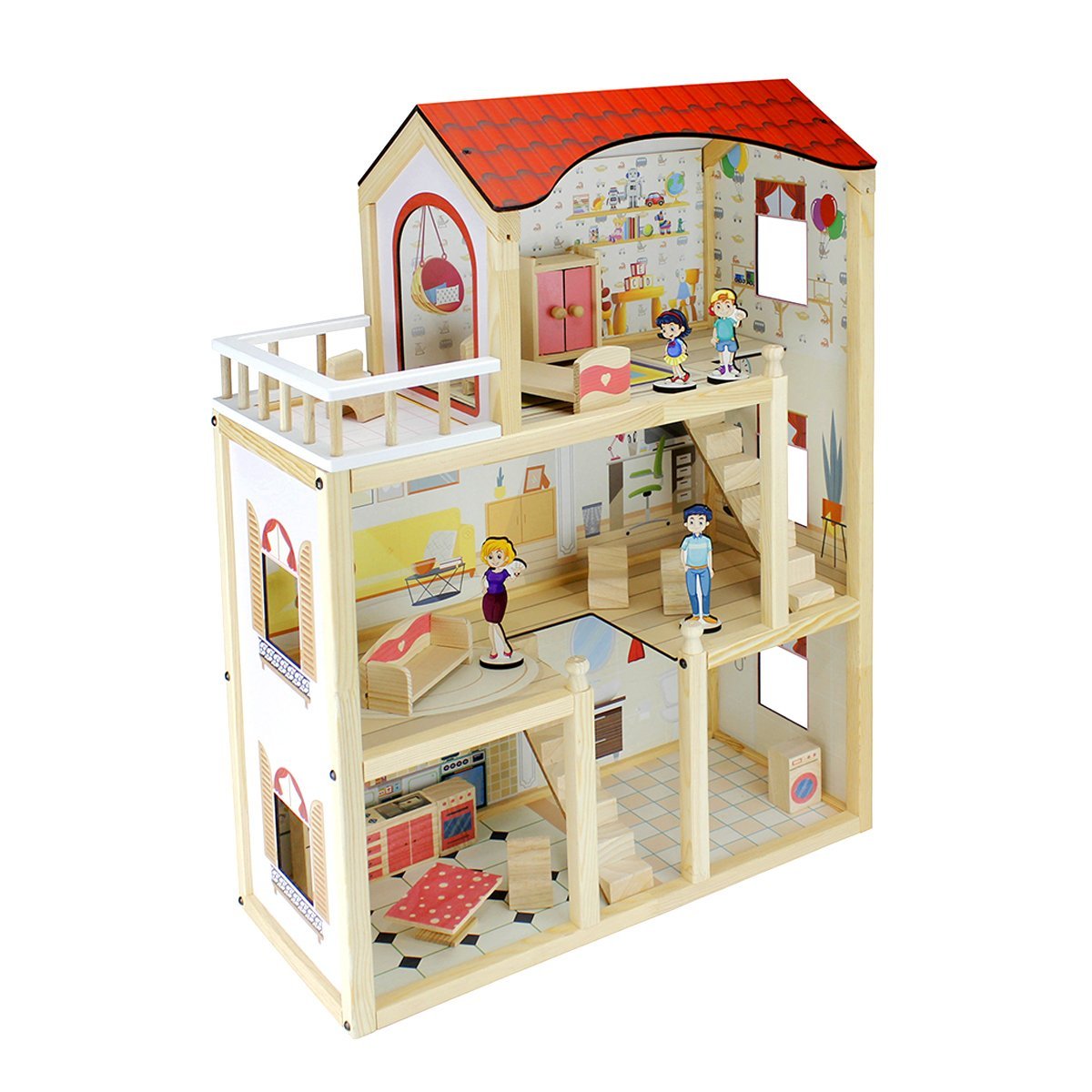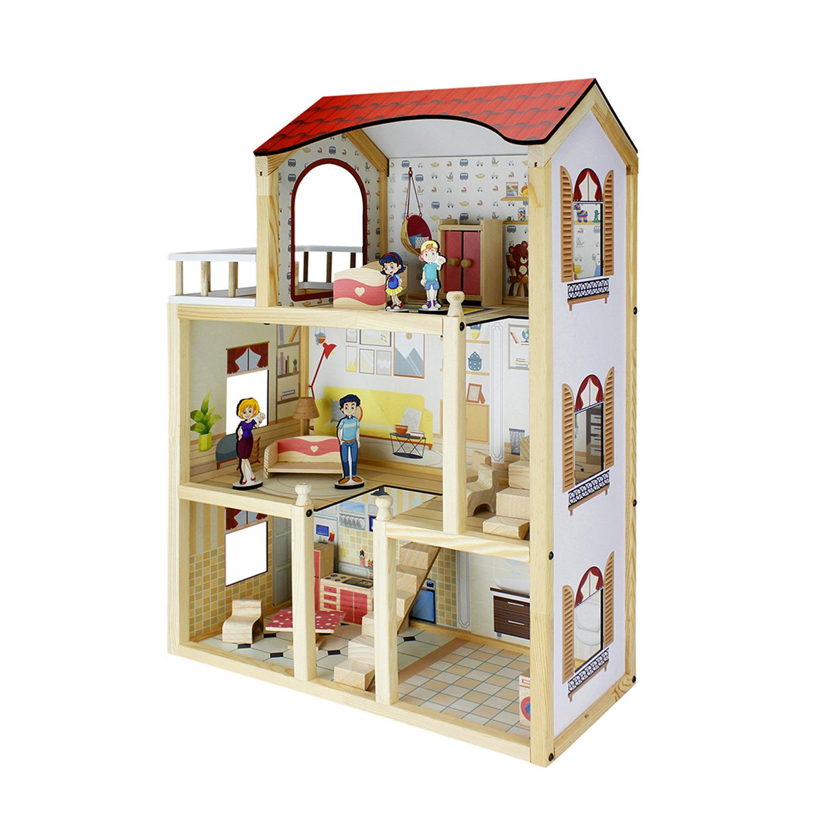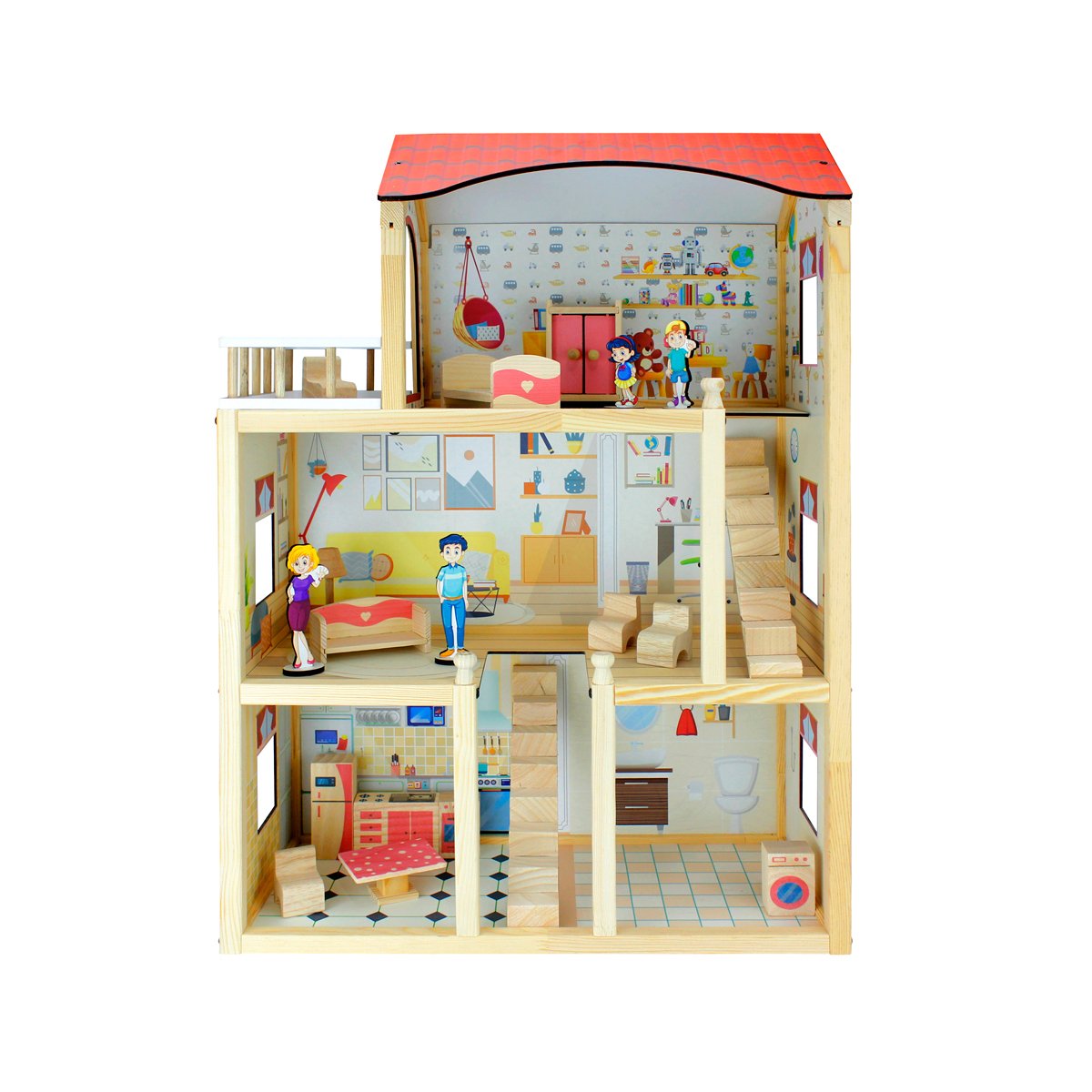 13 parça doğal ağaç oyun eşyası ve mini aile figürleri ile birlikte gönderilmektedir. Görsel baskılar uv baskı ile yapılmıştır.