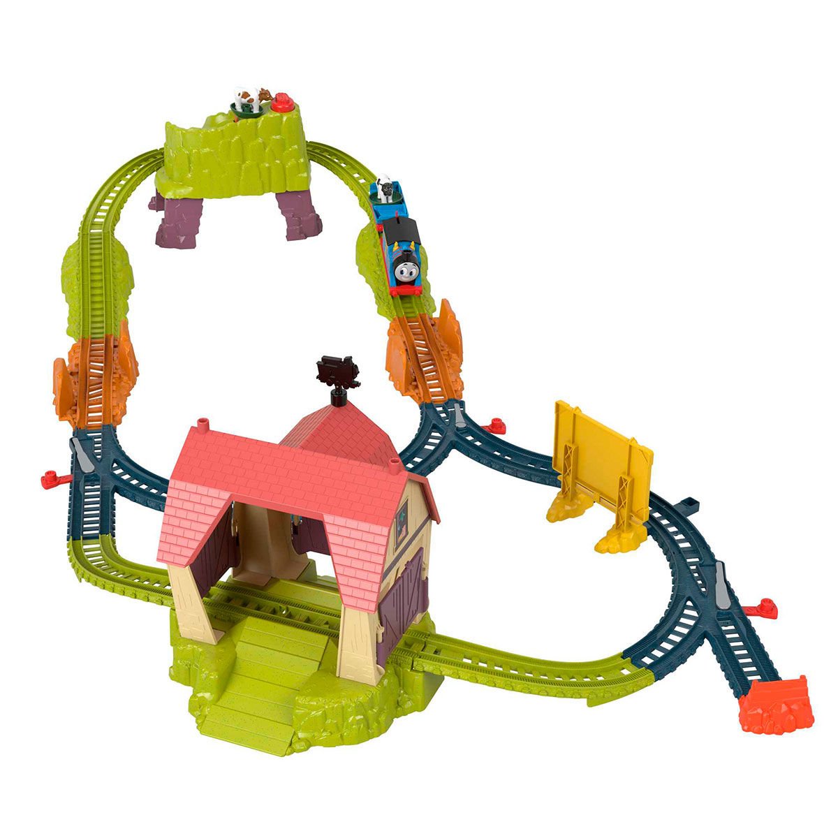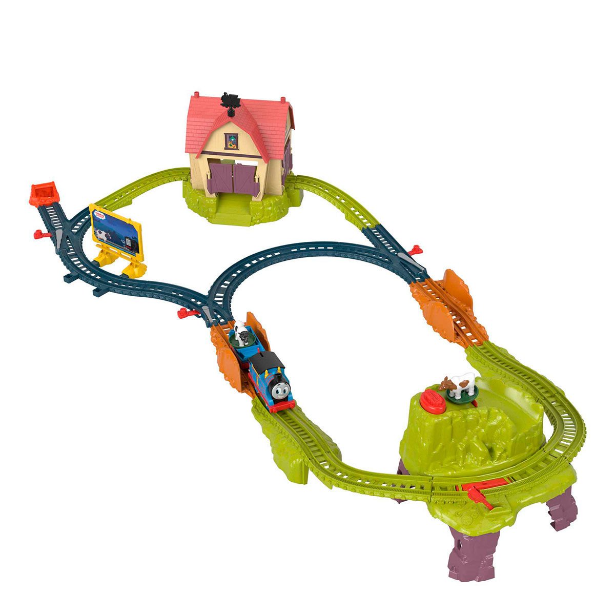 'Sarsıntılı' bir yolculuk için sallanan ray parçaları içerir. Tombul iki ineği Thomas'ın yük vagonuna bindirin ve hareketli çiftlik kapısından çayıra gönderin.