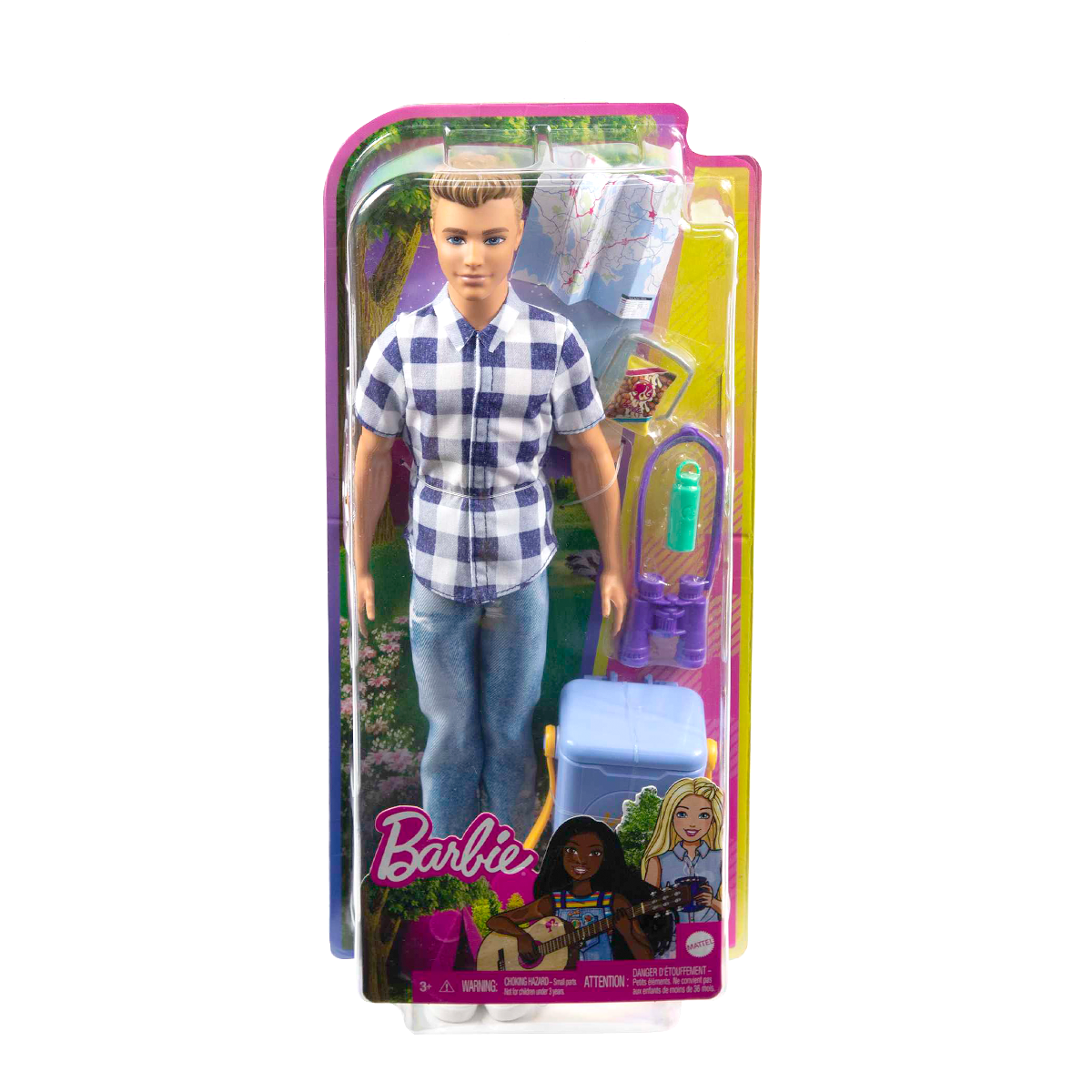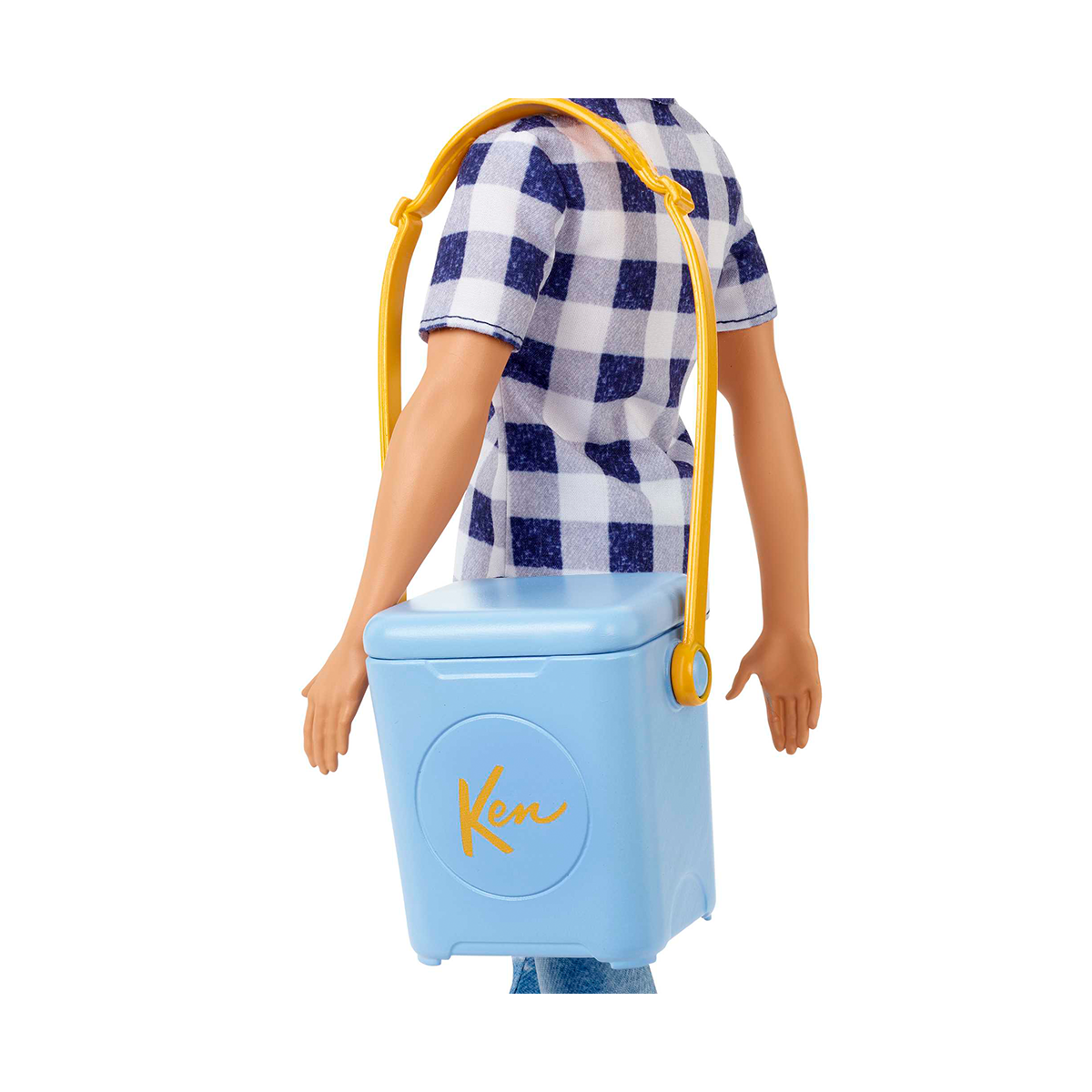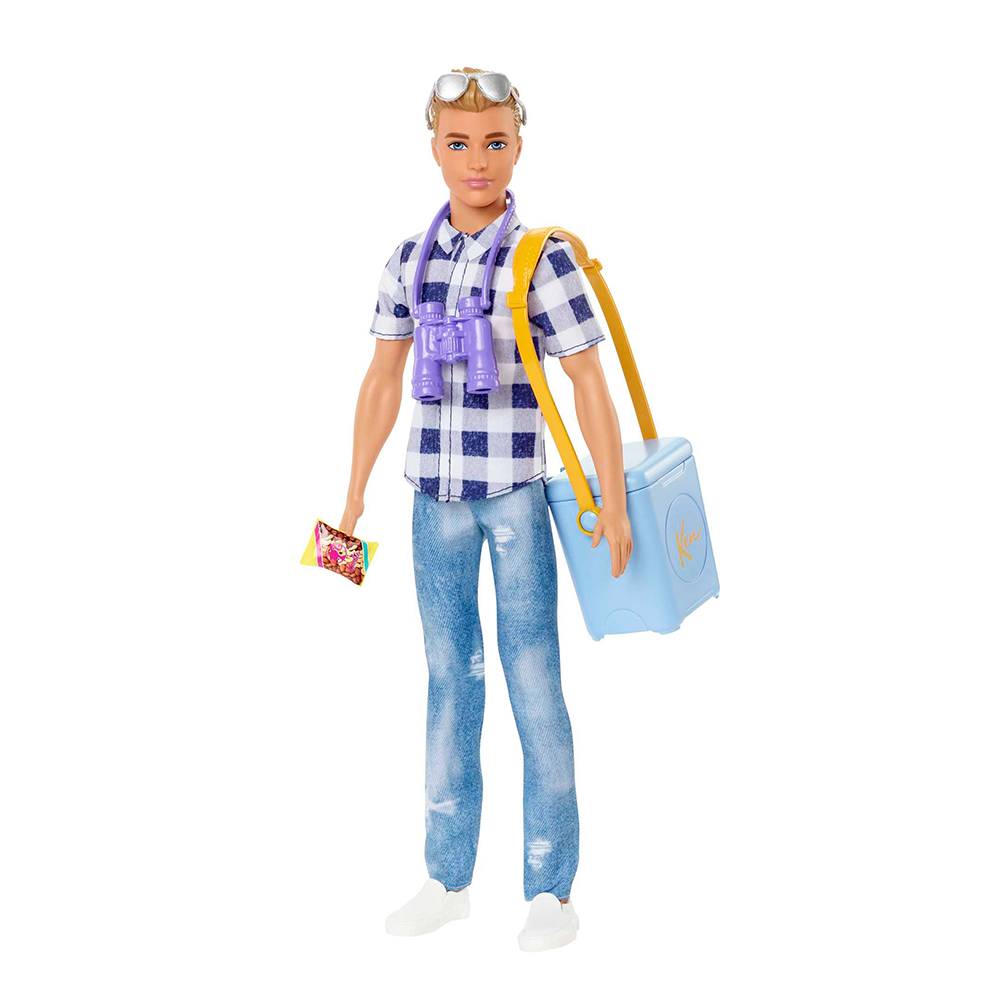 Ken ile kamp eğlencesinin keyfini çıkarın! Mavi ve beyaz ekose desenli, önü düğmeli gömleği, eskitilmiş kot pantolonu ve beyaz spor ayakkabılarıyla Ken, açık havada eğlenmeye hazır.