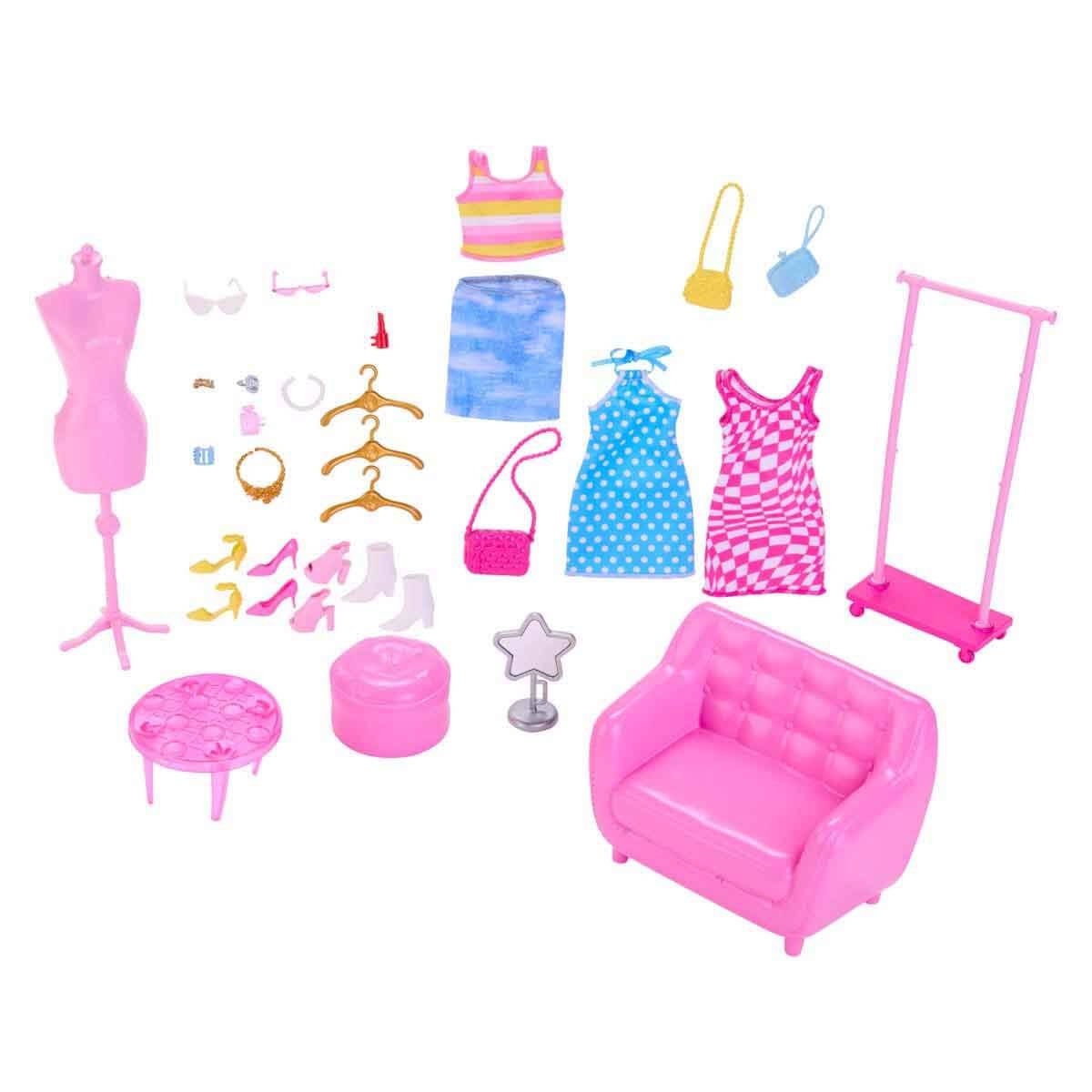 Barbie bebek; içinde kıyafet, mobilya ve aksesuarların olduğu bu harika moda setiyle hayallerinin dolabını yaratmaya hazır!