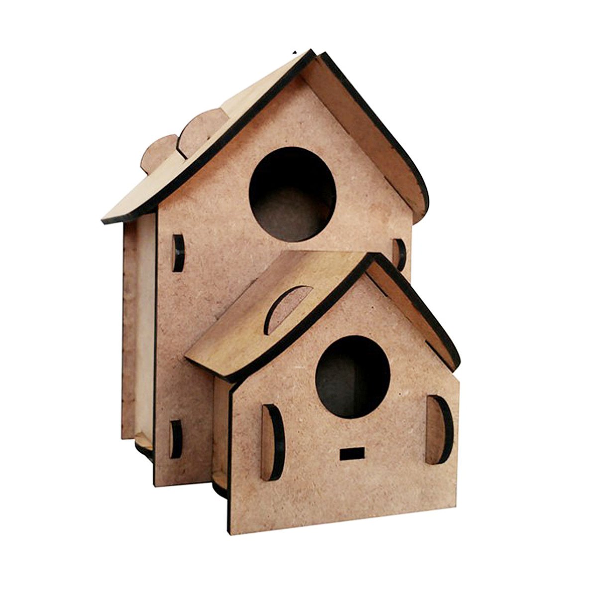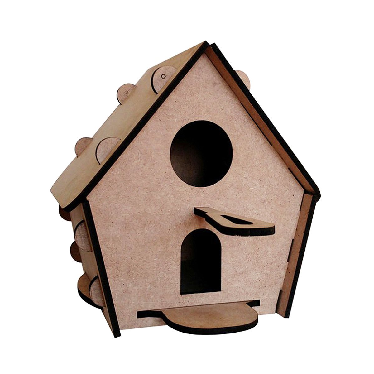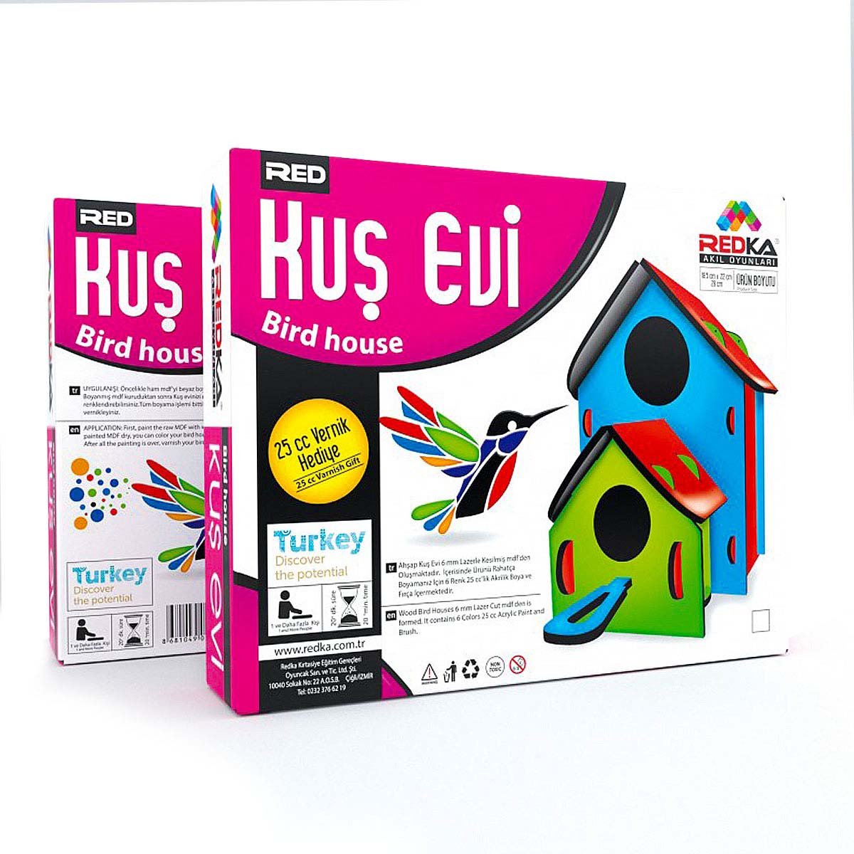 Kuş evi kutu içerisinde birbirine geçmeli, yapıştırma gerektirmeyen parçalardan oluşan ahşap tasarımlı güzel bir üründür. 6 renkli su bazlı boya ve fırçadan oluşmaktadır.