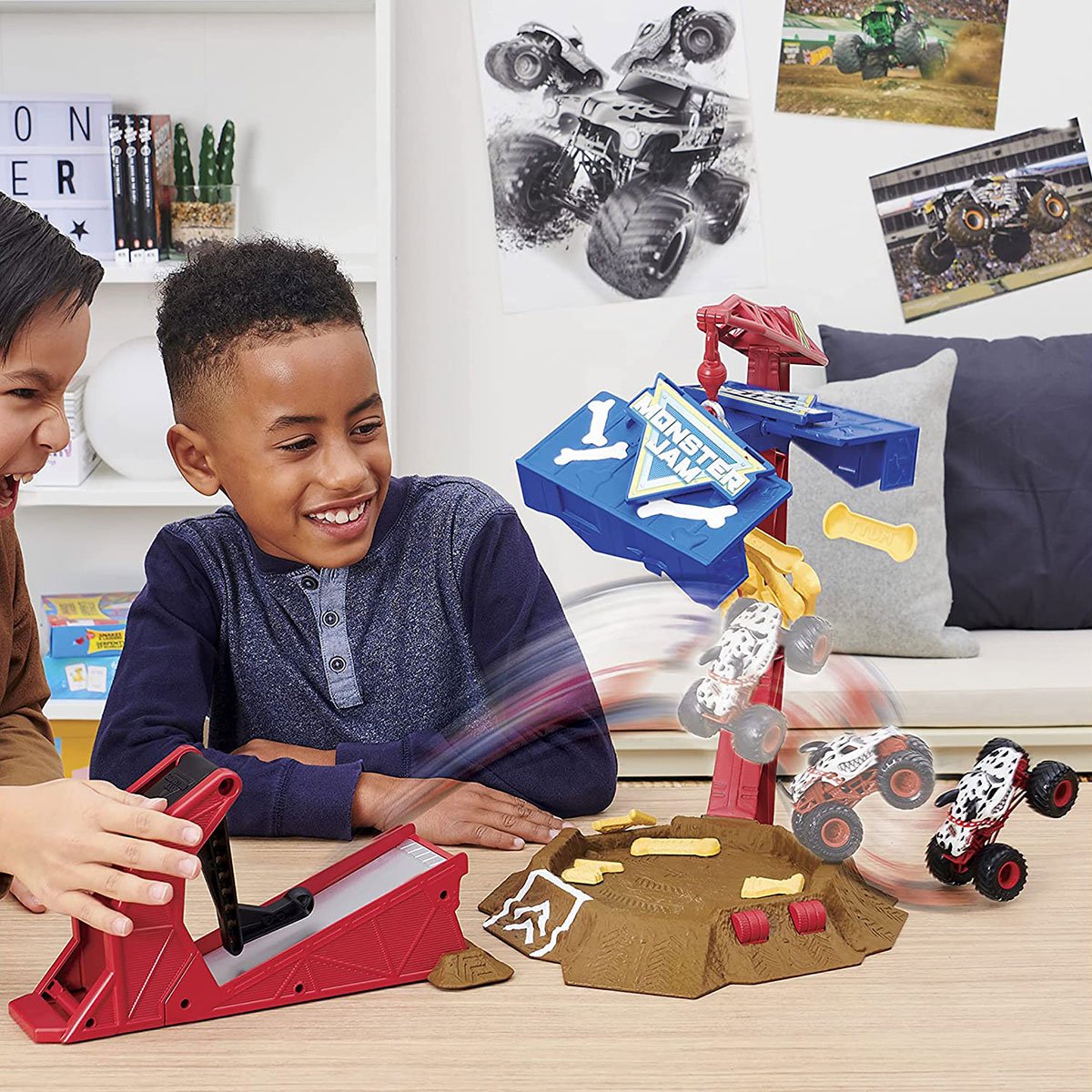 EPIC JUMPS: Bu harika oyun seti, süper yüksek atlamalar yapmanızı sağlar! Fırlatıcıyı çarp ve özel Monster Mutt Dalmatian'ı doğrudan rampadan Monster Jam aksiyonuna gönder!