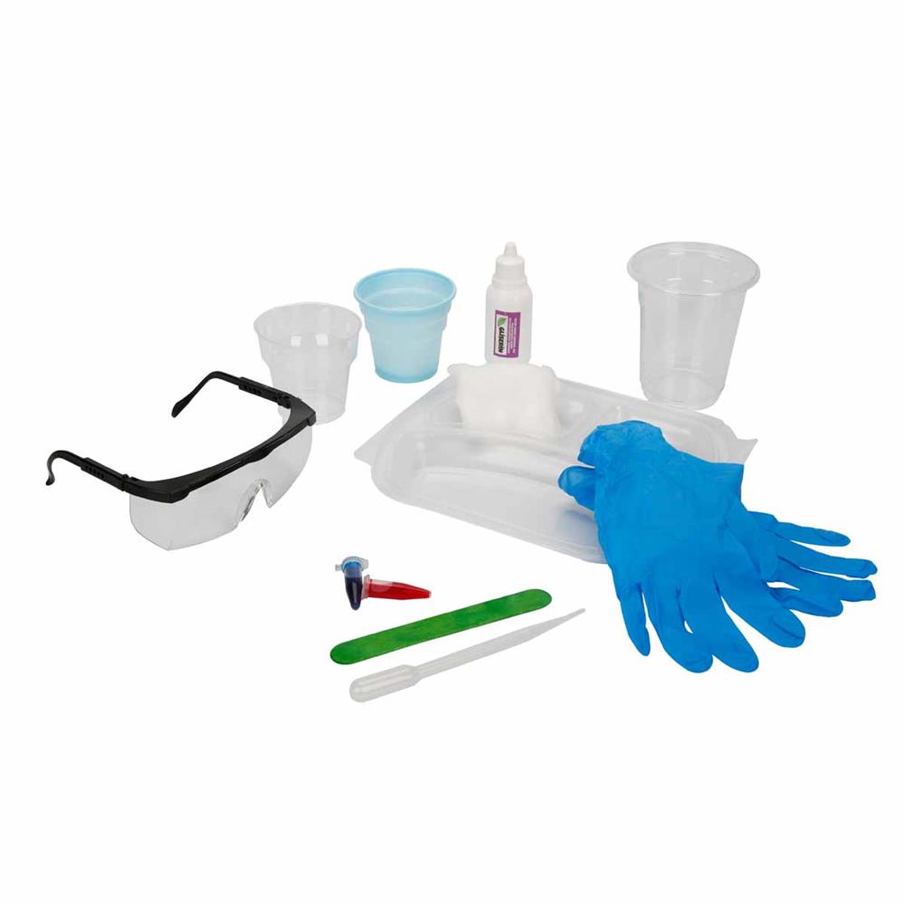 Kutu içerisinde; Renkli abeslang, deney bardağı, alt zemin, kar jeli, gıda boyası, pastör pipeti, deney gözlüğü, gliserin ve pamuk bulunmaktadır.