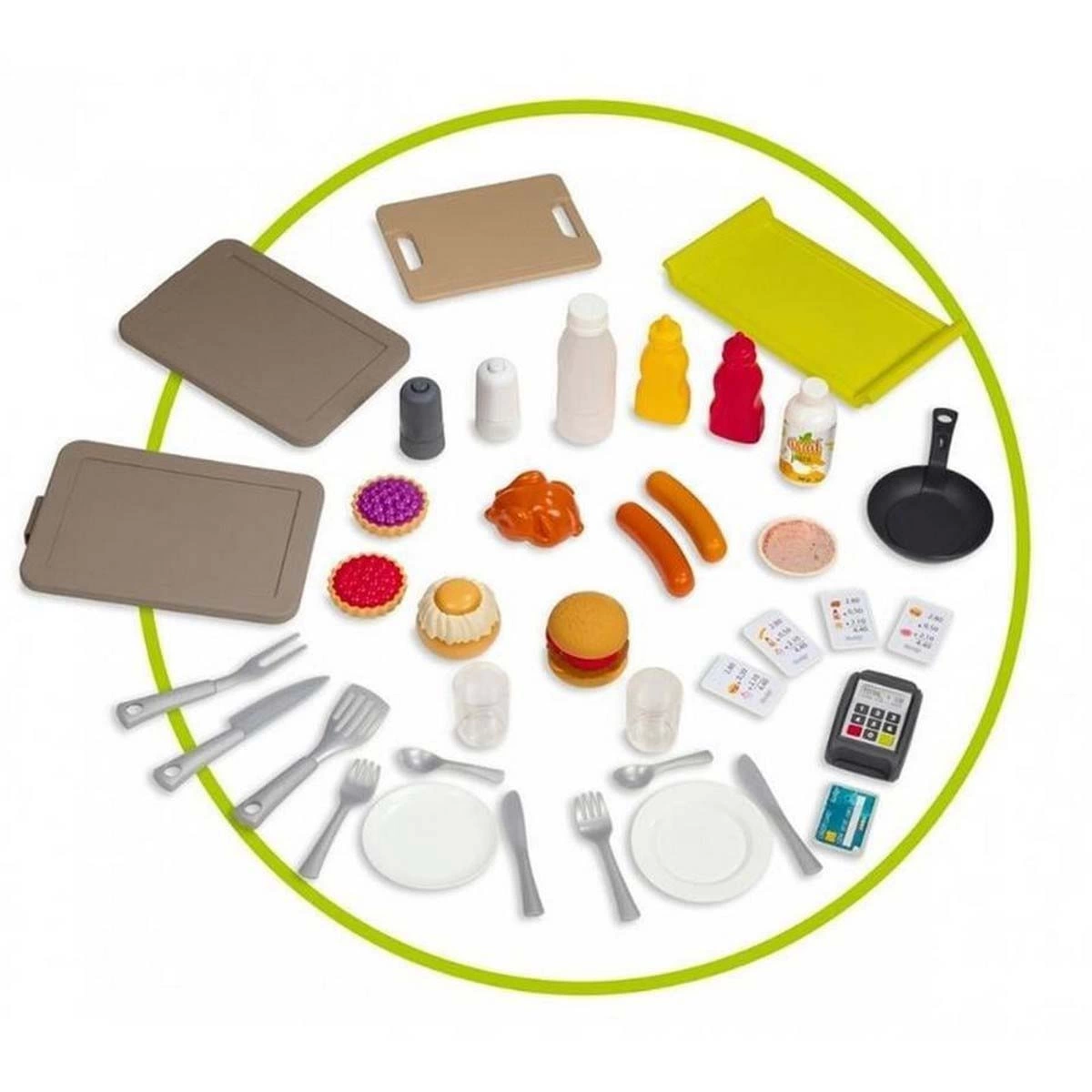 2. **Oyuncak Aksesuarlar**: Set, 38 parça oyuncak aksesuar içerir. Bunlar arasında tavuk, tatlı ve tuzlu kurabiyeler, ketçap, hardal, meyve suyu kutuları, sosisler, tabaklar, çatal-kaşık setleri, servis tepsileri ve daha fazlası bulunur. Bu aksesuarlar, çocukların yemeklerini servis etmeleri ve rol yapma oyunları oynamaları için idealdir.