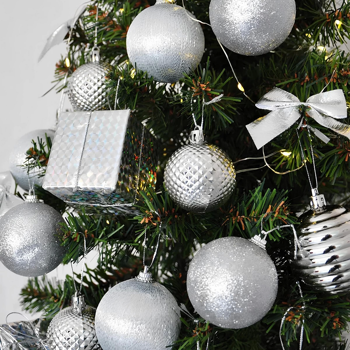 Yılbaşı ağacınızı zarif ve modern bir görünümle süslemek için tasarlanmış Yılbaşı Ağaç Süsleme Seti Gümüş, ışıltılı ve şık bir